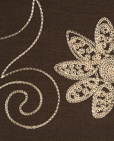 This upholstery fabric features a rich brown base accented with metallic cream threading in an embroidered floral design, creating a sophisticated and dimensional look. The blend of polyester and nylon provides durability and structure, while the metallic detail adds a subtle sheen, making it ideal for both decorative and high-use applications.