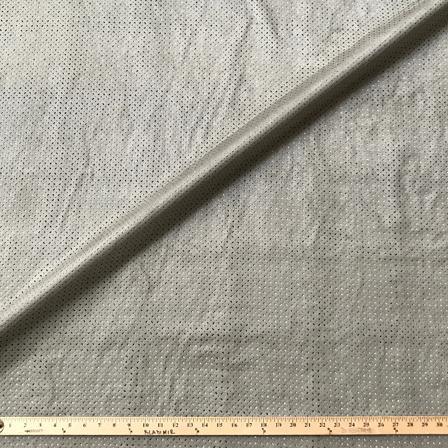 Sage colored suede blend fabric with a cut out geometric pattern.