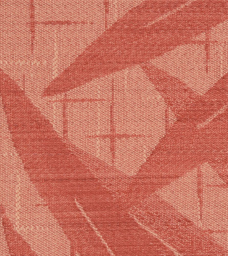 Description: Coral and peach colored fabric with palm tree motif in a Jacquard weave design. To be used for light upholstery and bedding.