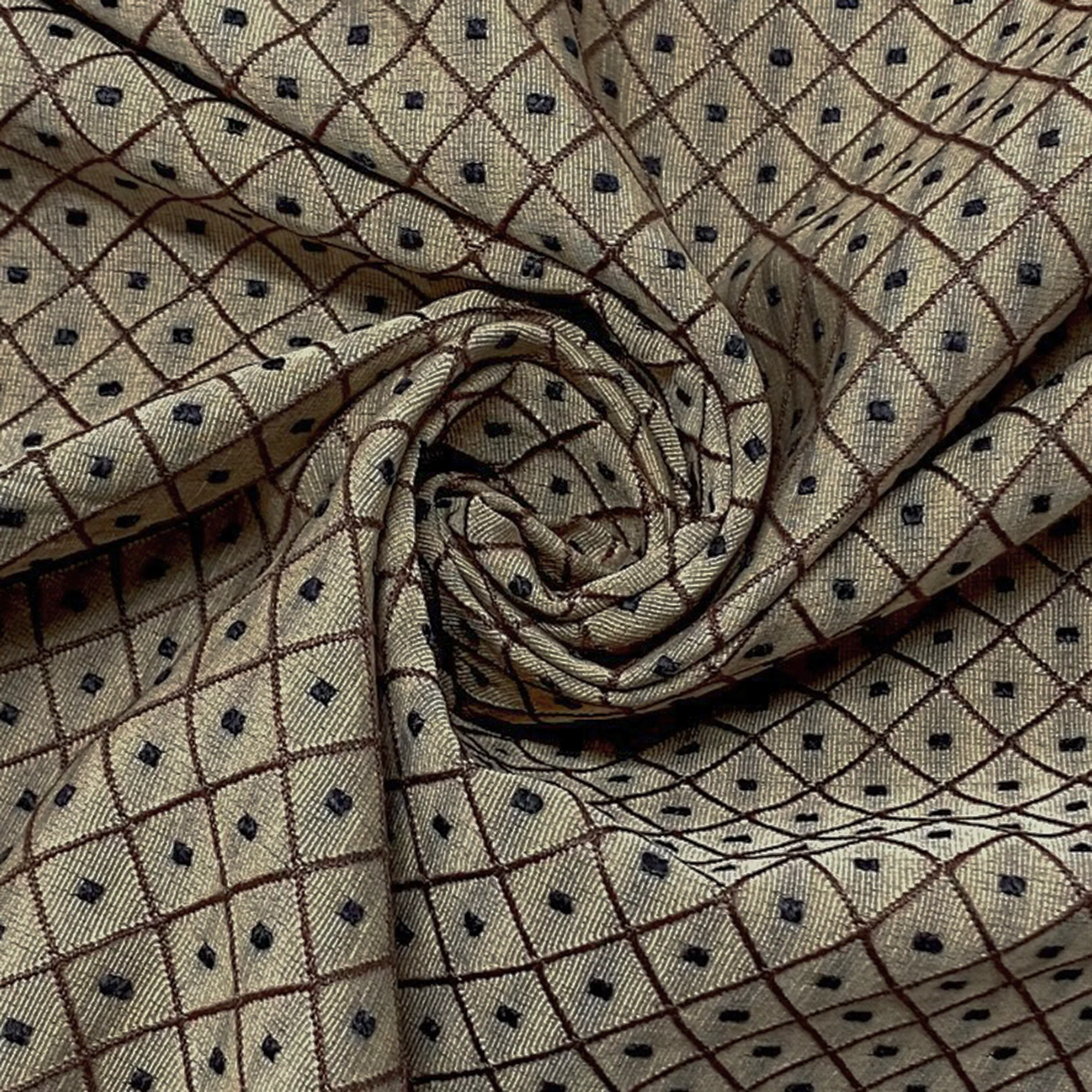 Diamond trellis jacquard upholstery fabric featuring a tissue pick weave for embroidered detail in neutral beige, brown and black.