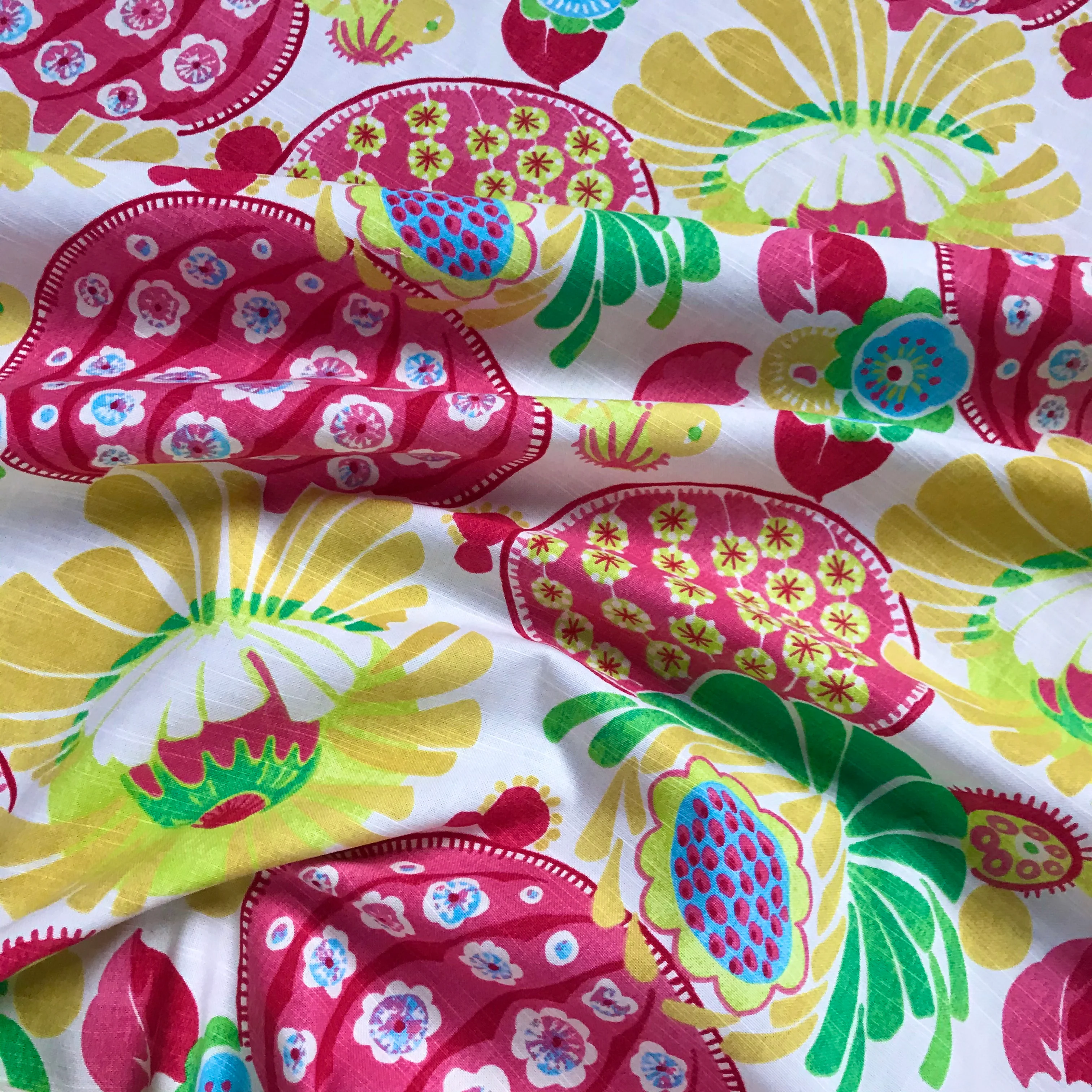 Fabulously printed cotton fabric features bold floral designs in bright summery hues, perfect for a fun and feminine decor.
