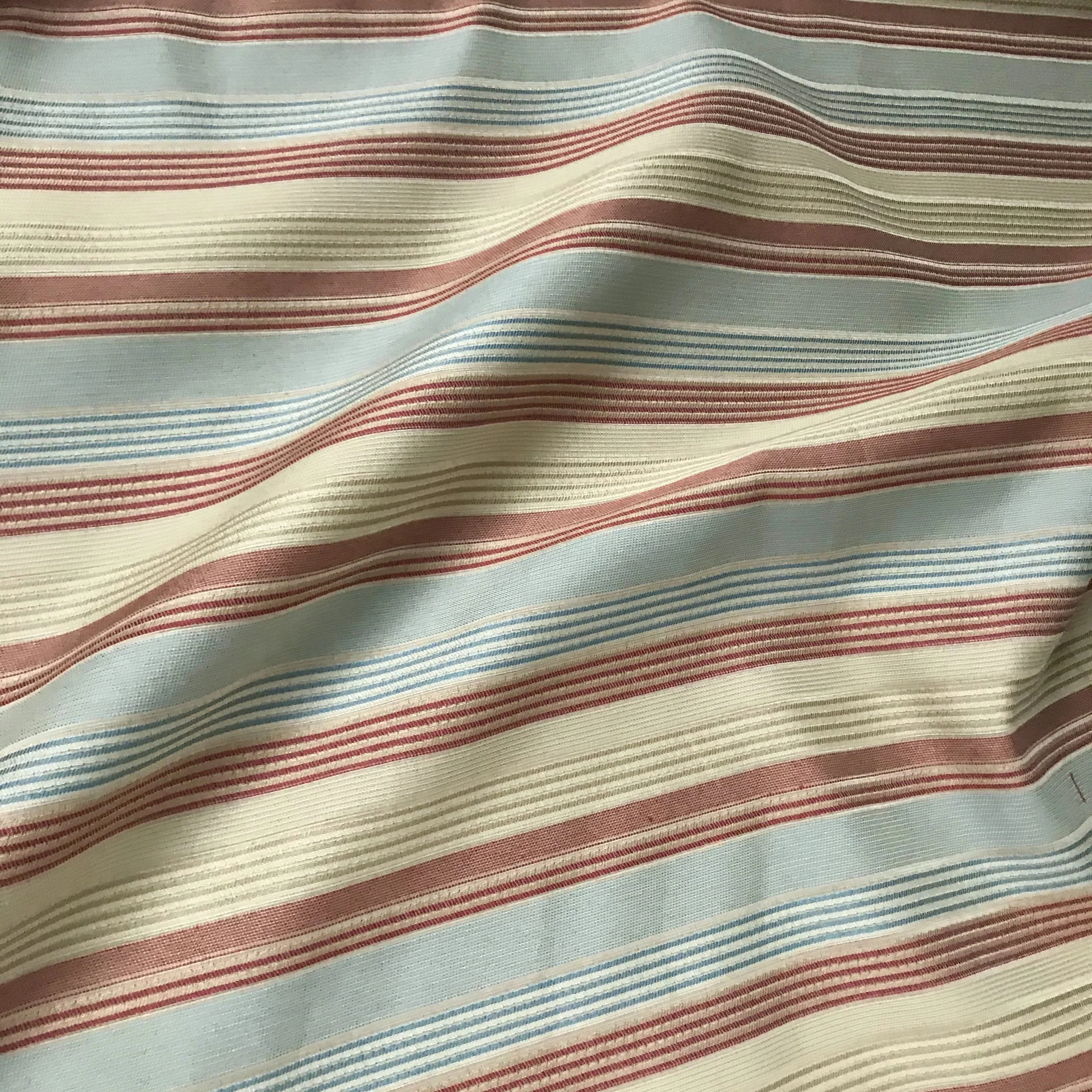 Lightweight, textured upholstery fabric in light blue, rose red, and ivory stripe design across the roll